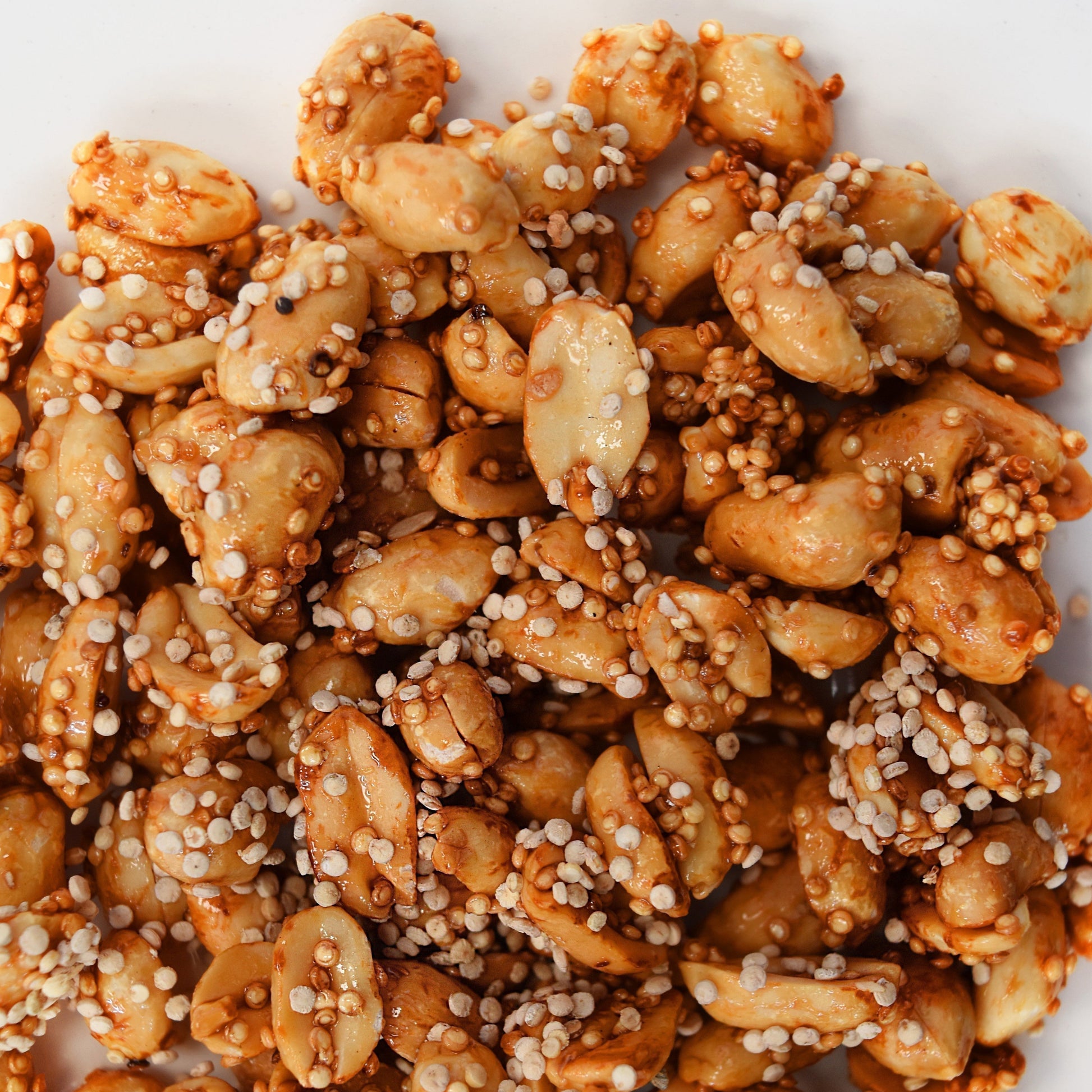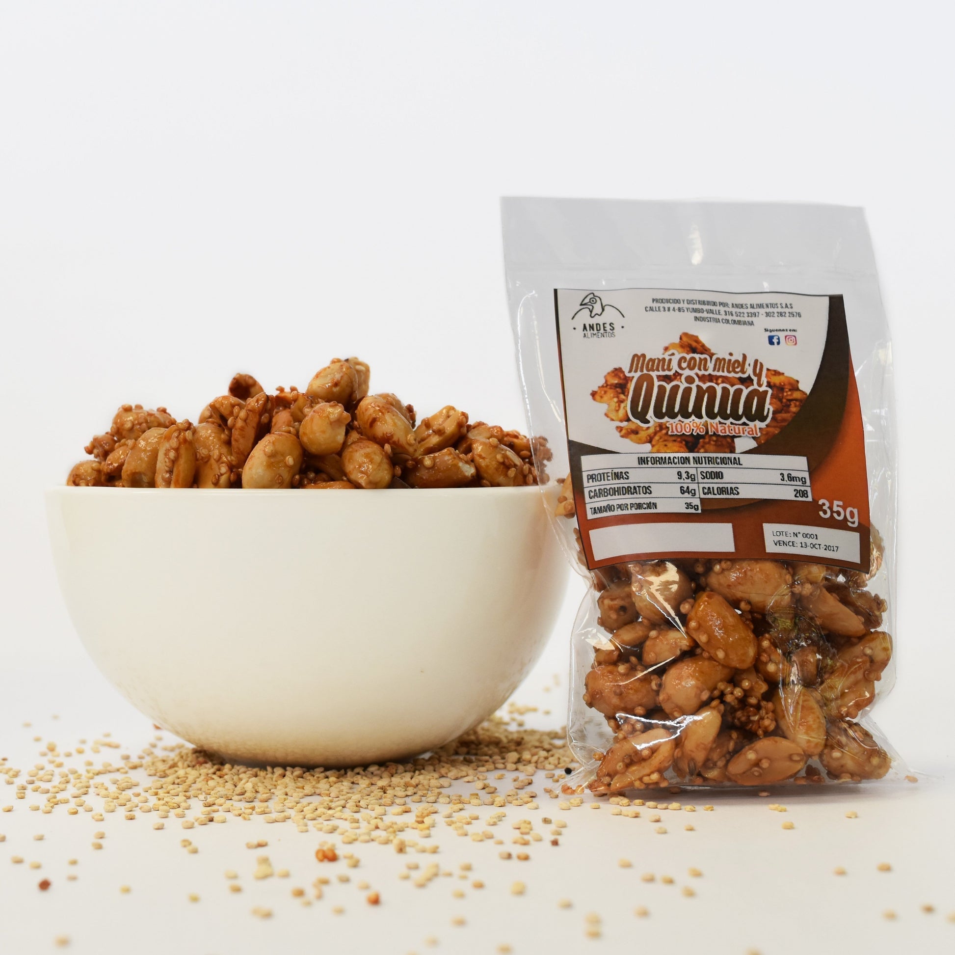 Delicioso maní horneado recubierto por una fina capa de miel y esquisitas semillas de Quinua que le dan un sabor unico y suave.